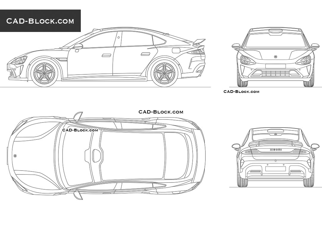 The modern Xiaomi electric vehicle in AutoCAD (DWG) format. The vector illustration emphasizes the harmony of technology and design: distinctive headlights, sleek body contours, and refined details. A versatile model for engineering, illustrations, and technical projects.
