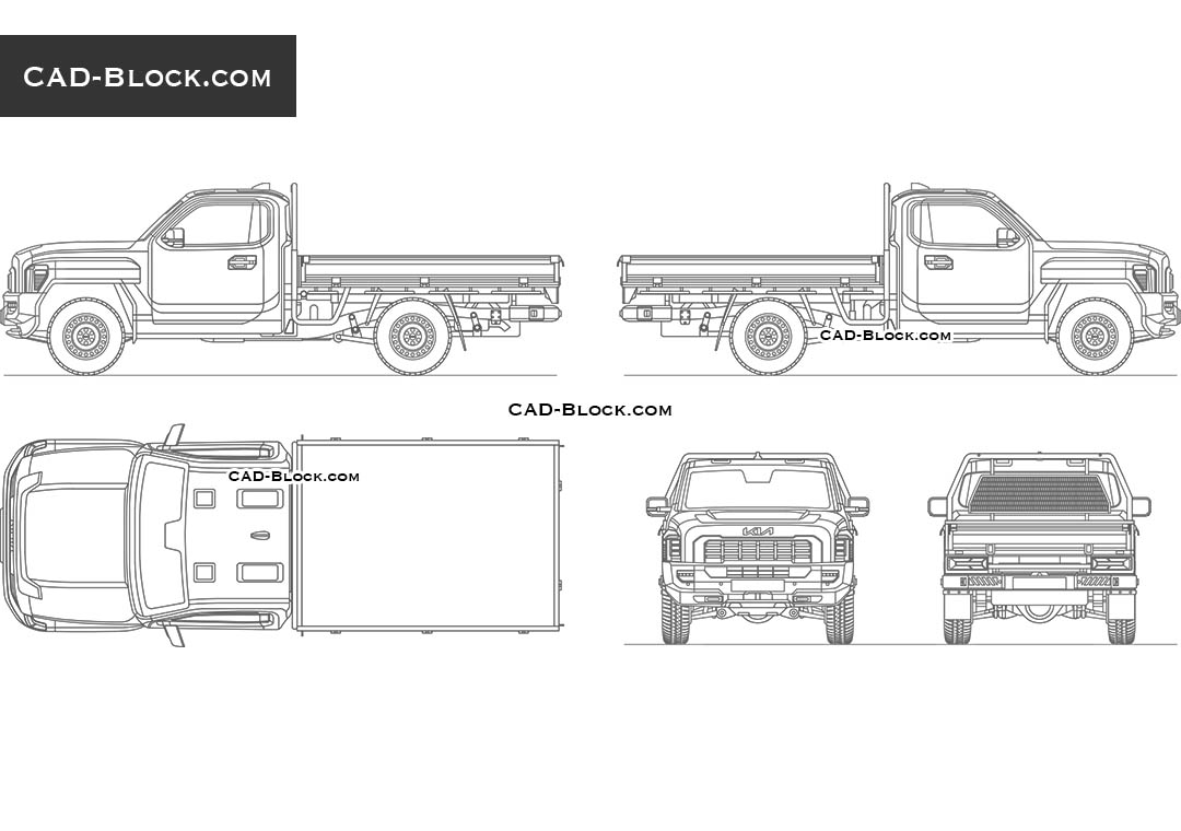 A single-cab utility pickup drawn in a precise technical style. The vector illustration accurately captures the cab geometry, cargo bed, and characteristic side profile. The drawing is optimized for CAD blocks: clean curves, uniform structure, and no unnecessary decorative elements. Ideal for industrial layouts, logistics schemes, etc.