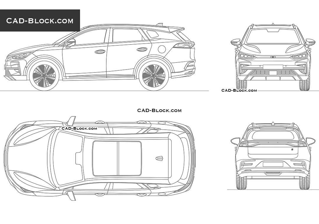 The BYD Tang EV CAD block represents a full-size electric SUV with a dynamic and modern design. The vector model is optimized for use in AutoCAD drawings, site plans, parking layouts, and contemporary architectural visualizations.